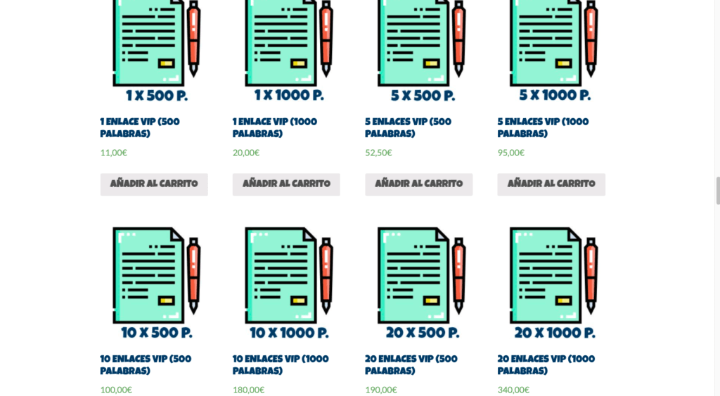Tiene paquetes de enlaces que van desde 10 hasta 1000 backlinks y los precios van desde 15 hasta 970 euros para el paquete más grande.